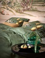 Stylish, chic duvet cover with a flower print on a green background, with an green backside, by ESSENZA. The duvet cover is made of 100% organic cotton sateen, GOTS certified.